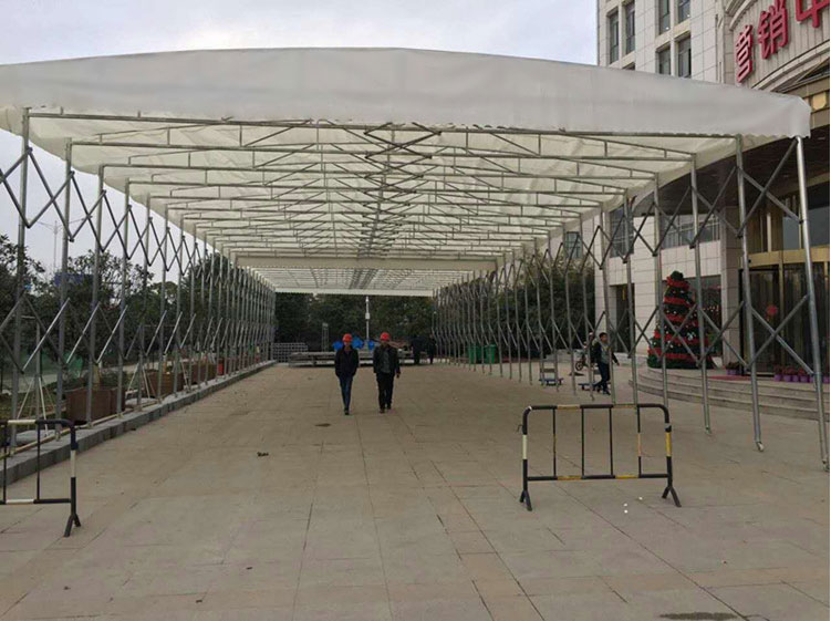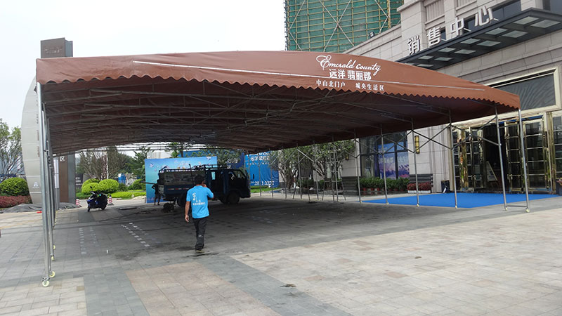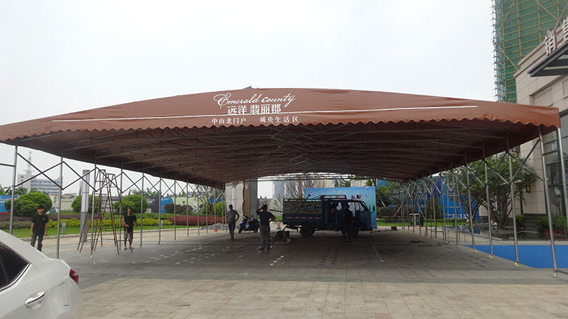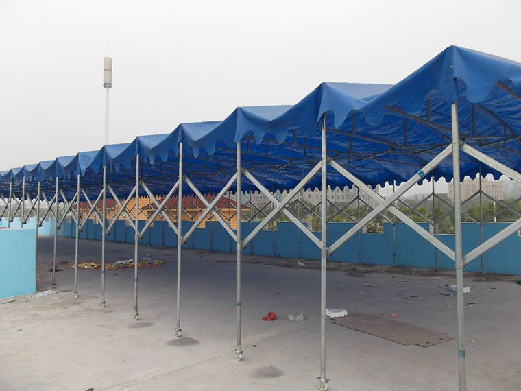 大型推拉帳篷: 1、材料 支架:2寸鍍鋅圓管(1.5mm厚度) 篷布:汽車帆布(防曬,防水,抗老化) 輪腳:4寸萬向尼龍腳輪(活動自由) 2、規(guī)格:可根據(jù)客戶實際需要尺寸定做 3、產(chǎn)品特點:靈活